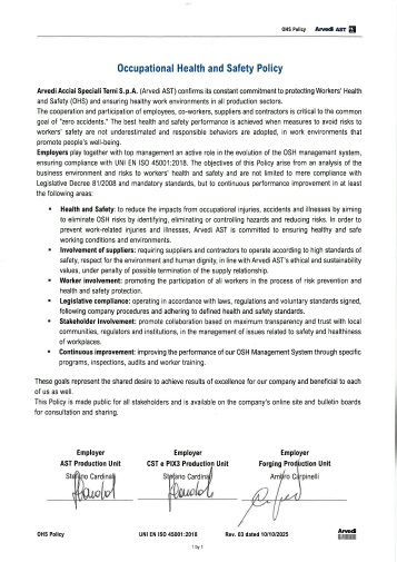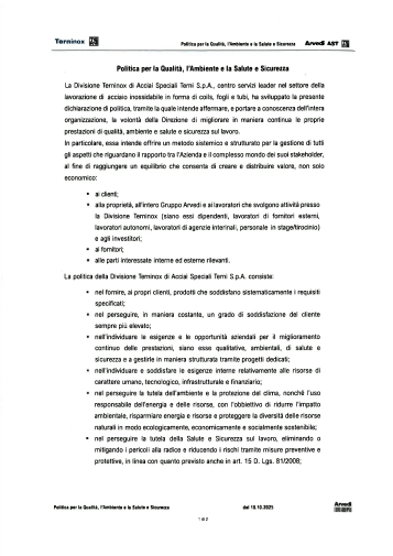Furthermore Acciai Speciali Terni owns a certificate as Material Organization according to American Society of Mechanical Engineers concerning its Divisione Fucine and a certificate according to IATF 16949:2016 standard for its Finishing Center and for welded tubes production (Tubificio di Terni S.r.l.).