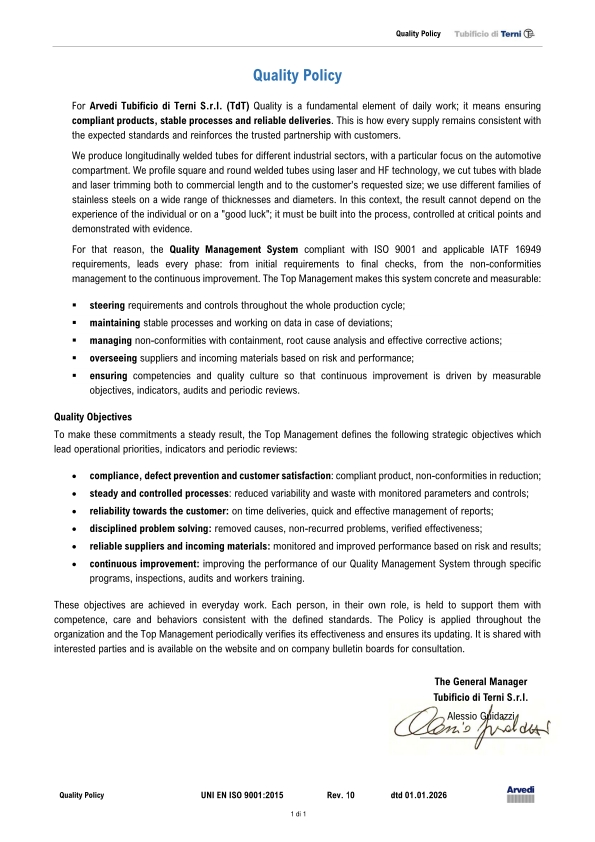 Furthermore Acciai Speciali Terni owns a certificate as Material Organization according to American Society of Mechanical Engineers concerning its Divisione Fucine and a certificate according to IATF 16949:2016 standard for its Finishing Center and for welded tubes production (Tubificio di Terni S.r.l.).