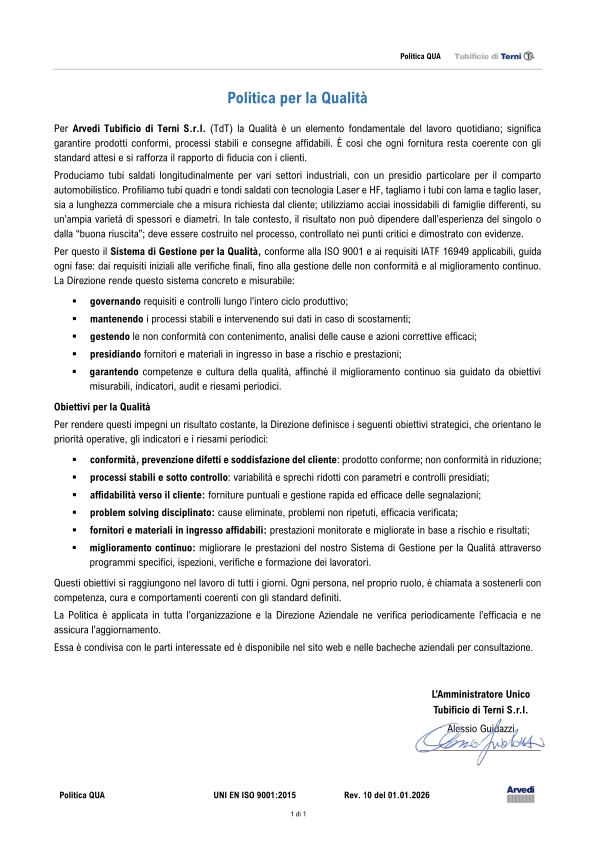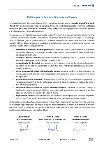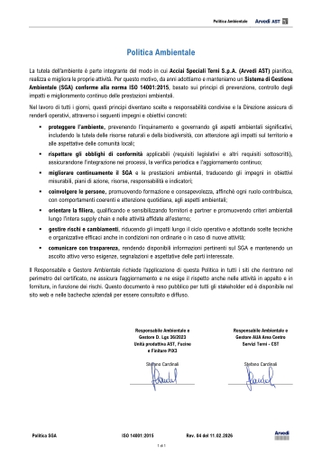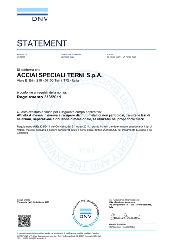 La tradizione del gruppo Acciai Speciali Terni nella gestione delle proprie produzioni secondo un Sistema Qualità ha inizio negli anni ‘70 con l’acquisizione del Quality System Certificate (Certificato del Sistema Qualità) ASME (The American Society of Mechanical Engineers). Oggi Acciai Speciali Terni vanta sistemi di gestione certificati in accordo agli standard ISO 9001:2015 (Qualità), ISO 45001:2018 (Salute e Sicurezza), ISO 14001:2015 (Ambiente) e ISO 50001:2018 (Energia) rilasciati dall’ente certificatore DNV.